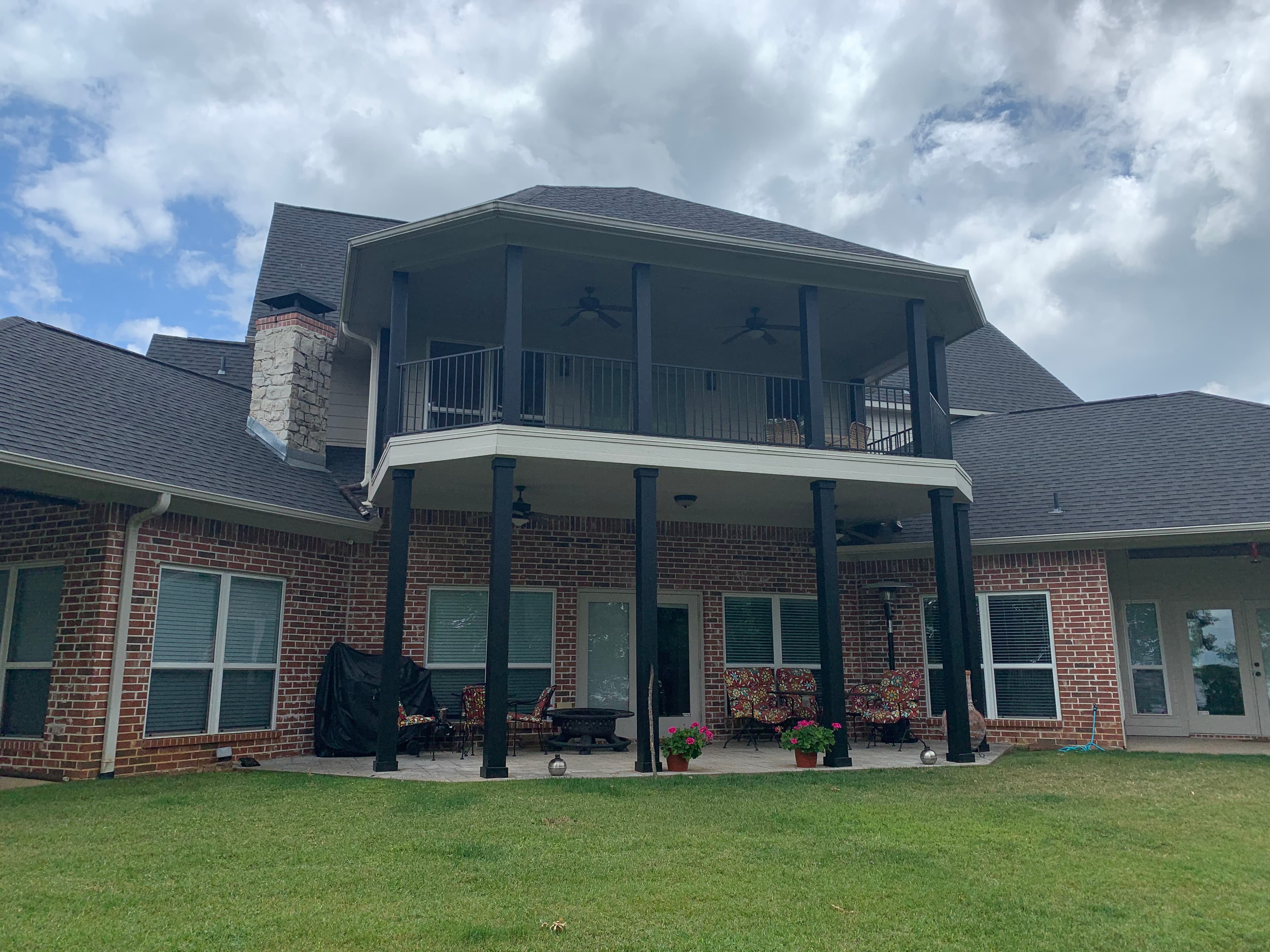 Back porch update in Flint, Texas. Existing posts wrapped and painted. Wood railing replaced with modern, iron railing.